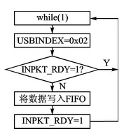 下面以IN端點(diǎn)2為例,說(shuō)明數(shù)據(jù)如何通過(guò)USB接口傳遞到電腦上。當(dāng)電腦發(fā)出IN請(qǐng)求時(shí),如果USB端點(diǎn)2的FIFO非空,就向電腦發(fā)送FIFO里的內(nèi)容;如果FIFO為空,則向電腦發(fā)送一個(gè)空包作為回應(yīng)。CC2531通過(guò)寄存器位USBCSIL.INPKT_RDY來(lái)控制電腦和8051 MCU內(nèi)核對(duì)USB的FIFO的使用權(quán)。當(dāng)INPKT_RDY=1時(shí),電腦正在對(duì)USB端口進(jìn)行訪(fǎng)問(wèn),8051 MCU內(nèi)核無(wú)法向FIFO內(nèi)寫(xiě)入數(shù)據(jù);當(dāng)INPKT_RDY=0時(shí),8051 MCU內(nèi)核可以將發(fā)送數(shù)據(jù)寫(xiě)入FIFO內(nèi),置位INPKT_RDY=1,完成數(shù)據(jù)的上傳。其流程如圖4所示。