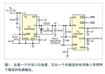 PND(個人導(dǎo)航設(shè)備)一類的汽車配件通常會用一個插入到點煙器的簡單適配器,獲得自己的電源并充電。不過,有時候可能想同時為兩個設(shè)備供電或充電。圖1中的電路可以完成這個任務(wù)。