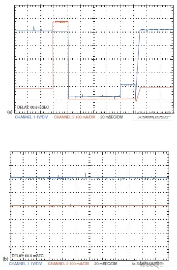 圖2顯示了保護功能的作用過程。輸出B有一個300mA的恒定負載,輸出A則在100mA負載和600 mA負載之間切換。當出現(xiàn)一個過載時,輸出A被關(guān)斷,但有一個20 ms的延遲,以避免對短時的瞬流作出響應(yīng)(圖2a)。電路在80 ms后消除過載;再經(jīng)過20 ms的延遲,自動重啟功能使輸出A重新連線。輸出B根本察覺不到輸出A的問題(圖2b)。不過,故障指示輸出端變?yōu)榈停硎就ǖ繟有一個問題。