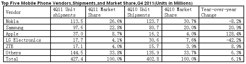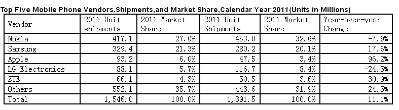 2011 年第四季度,全球共賣出4.274 億部手機.同比去年( 4.028 億部)上升6.1 % ,這一漲勢高于IDC此前預測的4.4 % 漲幅,但低于2011 年第三季度9.3%的增幅。其中功能機的市場份額比預期的衰減速度更快,市場增幅為兩年來最低。