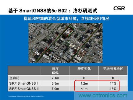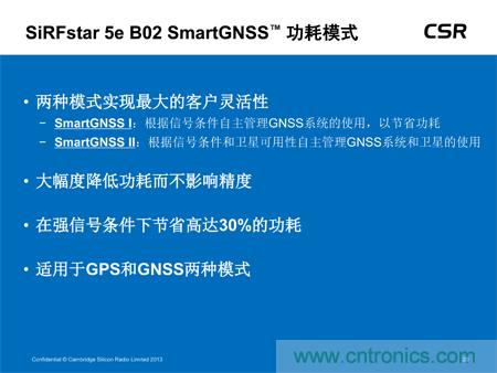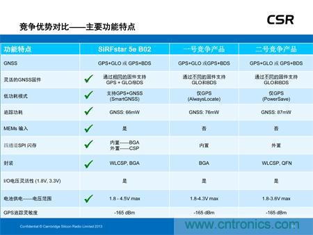 可穿戴設(shè)備應(yīng)用。該低功耗器件現(xiàn)已全面投入生產(chǎn),不僅可大幅度降低功耗且不影響定位精度,還可提供多衛(wèi)星GNSS支持,可滿足所有地區(qū)對(duì)GNSS的需求,包括美國的GPS、歐洲的伽利略、俄國的Glonass及中國的北斗衛(wèi)星系統(tǒng)。此外,SiRFstar 5e B02還搭載了CSR全新的SmartGNSS技術(shù),可提供兩種模式最大程度地降低功耗,并能夠根據(jù)信號(hào)條件及衛(wèi)星可用性自主管理GNSS系統(tǒng)的應(yīng)用。