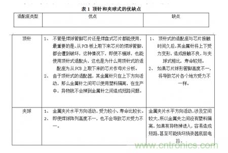 夾球和頂針式的適配座,各有優缺點,應用在不同場合,如表1所示。