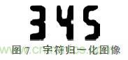 得到字符在圖像中的位置后,即可將字符從圖像中分割出來(lái)。由于實(shí)際分割過(guò)程中每個(gè)字符大小不一致,如圖6所示,所以對(duì)分割字符進(jìn)行歸一化處理,使不同字符的大小統(tǒng)一為固定大小,便于后續(xù)字符分割。首先將圖6中字符周?chē)目瞻孜恢们谐缓蟛捎萌螛訔l插值的方法,對(duì)源圖像附近的4×4個(gè)鄰近像素進(jìn)行三次樣條擬合,最后將目標(biāo)像素對(duì)應(yīng)的三次樣條值作為目標(biāo)圖像對(duì)應(yīng)像素點(diǎn)的值。將字符歸一化以后,所得各個(gè)字符如下圖7所示。