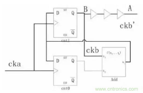為了方便討論,時鐘樹插入以后,假設A與B之間有1個ckaCycle的skew;從圖3可以看到如果采用A點作加法器的輸入時產(chǎn)生的波形是ckb’,采用B點作為輸入時的波形是ckb,顯然,從例1的代碼來看,ckb才是正確的。因此必須注意到,如果時鐘當作普通的信號使用時可能帶來的問題,這類問題并沒有一個通用的解決辦法。在這個例子中,不采用時鐘樹上的信號才是正確的,但是在另外一些應用中,就必須采用時鐘樹上的信號。比如,時鐘是CK的兩個觸發(fā)器中鎖存的數(shù)據(jù)再由CK的高電平和低電平選擇輸出,那么,這個時候就需要作為選擇信號的CK從時鐘樹上拉過來。因此,如果設計中用到了時鐘信號作為普通信號的情況,在后端設計時就必須特殊處理。