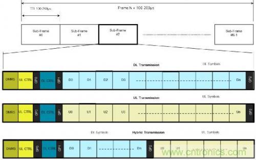 將端到端時延減小到 1ms 以內是 5G 的另一個重要目標,旨在滿足任務關鍵型應用的超高可靠低時延用例,以及擴展的移動寬帶用例(諸如承諾為服務提供商帶來更高收入的游戲)的要求。5G 正在改進幀結構以實現上述這一目標。圖 1 給出一種準 5G 標準幀結構方案。該方案具有 100-200 微秒級的很短的傳輸時間間隔(TTI),比 4G LTE 的 TTI(1ms)縮短 10 倍,具備快速的 Hybrid ARQ(自動重發請求)確認,可縮短系統時延。利用前載解調制參考和控制信號,可在接收幀的期間執行幀處理,而不是等緩沖整個子幀之后再處理。幀結構還用來簡化和加速每子幀的快速調度請求。因此,5G 基帶所需的計算與 4G LTE 系統相比會顯著增加。