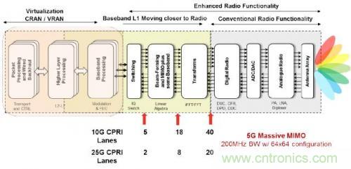 對于 6GHz 以下的部署,5G 系統通常多達 64 個天線單元。6GHz 以上可有更多的天線單元數量。數字波束形成一般用在 6GHz 頻率以下的情況(在基帶中實現);而結合了數字和模擬波束形成技術的混合方案則用于 6GHz 以上頻率。包含 64 個天線單元的 Massive MIMO 系統配置會顯著增加復雜性和成本,因為要支持 L1 基帶中數字波束形成所需的大量有源無線電信號鏈和預編碼計算。基帶處理信號鏈與遠端射頻單元之間的連接要求急劇增加。為了比較經濟地實現這些系統,有必要在無線電中集成 L1 基帶信號處理或其中的一部分。未來的這種功能劃分可能導致網絡節點中 L1-L2 與無線電功能處在相同位置。圖 3 介紹了 64 個天線單元的 Massive MIMO 在不同系統功能邊界上的連接要求,凸顯了 L1 與無線電共址的必要性。