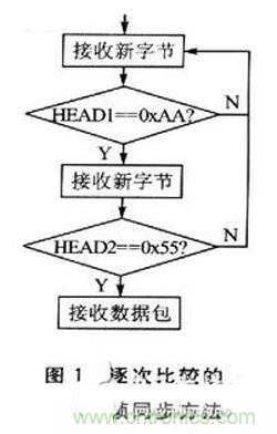 此種方法代碼量小,編程簡單,一般用于在主程序中以非中斷方式接收串口數據、實時性很差、數據幀較短的場合。但是,在串口速度過快且包頭字節數比較多的情況下,串口實現同步花費的時間很長或很難實現同步。例如,串口接收到序列Ox0O OxAA0xAA 0x55…,當遇到第一個“0xAA”時,該方法認為第1個字節正確開始比較第2個同步頭。第2個字節仍是“0xAA”而不是“0x55”,所以必須等待新的字節重新開始比較第1個同步頭。而緊隨其后的是“0x55”,因而,此時包頭的第1個字節也沒有同步上。事實上,“0x00 OxAA”是干擾字節,“0xAA 0x55”才是通信協議中的同步頭。