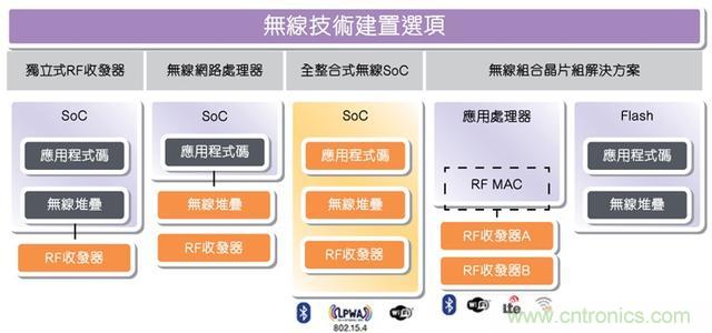 · 全整合式無線SoC:這是一種單芯片的單一建置方案,適用于特定的無線技術,尤其是用于物聯網應用的低功耗藍牙技術。鏈路層和PHY整合于SoC中,以執行所有的軟件堆棧和應用程序代碼。