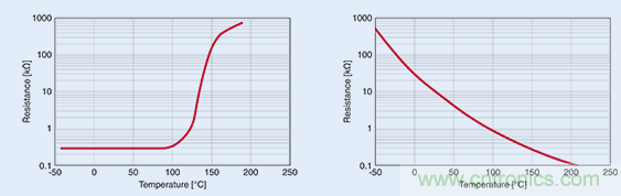 在超出某一特定溫度時,正溫度系數 (PTC) 熱敏電阻(左圖)的電阻出現急劇升高,故而適合用作溫度限值傳感器。而負溫度系數 (NTC) 熱敏電阻的電阻則呈線性關系,故而適用于溫度測量。