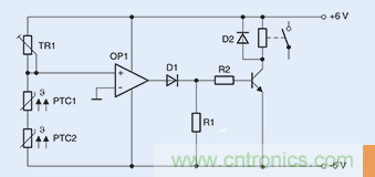 至于TR1,在設置時,其最大值應約等于常溫電阻的兩倍。而TR1還能夠相應地進行微調。在冷態(tài)下,非反相輸入端將出現電位,而這一電位相比反相輸入端電位則具有較高的負電位。這則意味著比較器輸出端出現負電壓。若某一個或兩個正溫度系數 (PTC) 傳感器達到相應的溫度限值,則分壓器的電位將出現變化,而比較器則將進行切換,并發(fā)送一個正輸出信號,進而切斷晶體管。