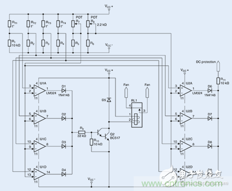 2個開關閾值的參考值將通過2個微調器,即R7和R8(分別為2.2 k?)進行設置。如上所述,兩個微調器將分別產生900?或550?的電阻。至于8個所需的比較器(U1A-U1D以及U2A-U2D),則采用經濟型LM324放大器。在滿負荷跳線模式下進行的一個持續(xù)數小時的測試表明,風扇能夠在85℃時可靠地進行開啟。由于系統(tǒng)具有相對較低的熱量期限,故而無需采用常用的滯回比較器電路。