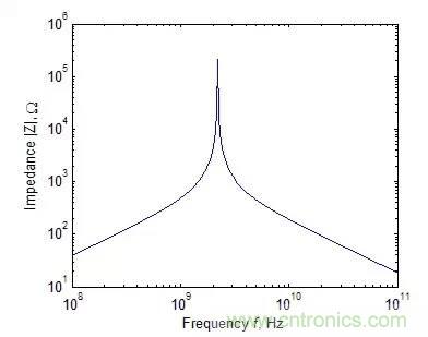 同樣可以得到一個(gè)典型的電容器的阻抗絕對(duì)值與頻率的關(guān)系。如下圖所示,由于存在介質(zhì)損耗和有限長(zhǎng)的引線,電容顯示出與電阻同樣的諧振特性。