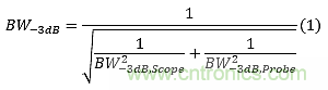 其中,BW-3dB、BW-3dB,Scope和BW-3dB,Probe分別是系統、示波器和探頭對應的帶寬(以Hz為單位)。本文使用2GHz示波器(Tektronix MSO 5204)。無源探頭(Tektronix TPP1000)的最大帶寬為1GHz。示波器和探頭之間的較低帶寬(1GHz)對系統帶寬有更大的影響。