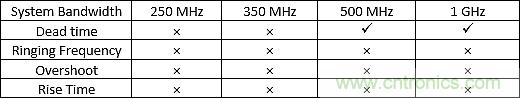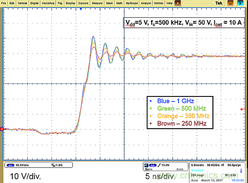 采用EPC8009的設計所測量到的振鈴頻率(fr1)為1.176GHz,它采用最高帶寬1GHz的探頭。圖2(頂部)中顯示的較低帶寬情況進一步降低了測量振鈴頻率的準確性。當考慮峰值電壓過沖時,同樣很明顯的是,較低帶寬測量值會低估各個開關器件的峰值電壓。對于與時序相關的死區時間的測量,系統帶寬也很重要。如圖2(頂部)所示,對于500MHz和1GHz帶寬,死區時間是可見的,雖然測量來并不是很精確。在較低帶寬下,死區時間幾乎不存在。表1顯示了采用最高速的EPC8009,系統帶寬對關鍵測量結果的影響。