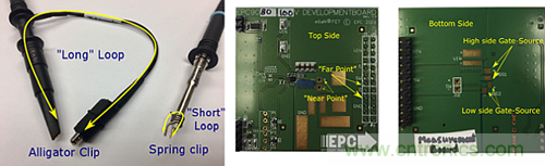 本節測量技術使用EPC9080半橋演示板。開關節點波形在圖3所示的兩點測量:靠近FET開關節點的“近點”;以及PCB外圍引腳端子處的“遠點” 。圖4顯示了每個探測點和配以探頭技術所測量的開關節點(VSW)的波形。