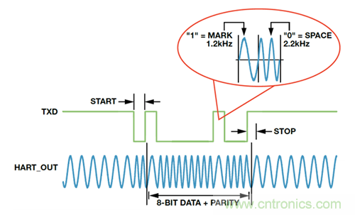 圖 2 顯示了調(diào)制涉及的主要模塊:FSK直接數(shù)字合成 (DDS)引擎、DAC(開(kāi)關(guān)電阻串類(lèi)型)和緩沖區(qū)。要發(fā)送的數(shù)字?jǐn)?shù)據(jù)通過(guò)UART輸入。調(diào)制器通過(guò)將RTS(請(qǐng)求發(fā)送)信號(hào)拉低來(lái)使能。調(diào)制器將TXD輸入端的UART編碼HART數(shù)據(jù)位流轉(zhuǎn)換成一系列二進(jìn)制 1200 Hz(“1”)和 2200 Hz(“0”)信號(hào)音(見(jiàn)圖 3)。DDS在任何一種頻率下生成正弦數(shù)字字流,DAC將其轉(zhuǎn)換為大約 493 mV的p-p模擬正弦波。此正弦波信號(hào)在內(nèi)部進(jìn)行緩沖并在HART_OUT引腳上輸出。該DDS引擎本身會(huì)產(chǎn)生連續(xù)相位信號(hào),因此在頻率之間切換時(shí)避免了出現(xiàn)任何輸出不連續(xù)。在HART_OUT上進(jìn)行內(nèi)部緩沖的主要優(yōu)勢(shì)是產(chǎn)生很高的驅(qū)動(dòng)能力,無(wú)需外部模擬緩沖,也不會(huì)出現(xiàn)它們帶來(lái)的問(wèn)題。HART_OUT引腳直流偏置至 0.75 V,并應(yīng)容性耦合至負(fù)載。有關(guān)更多詳細(xì)信息,請(qǐng)參見(jiàn)AD5700/AD5700-1 數(shù)據(jù)手冊(cè)。