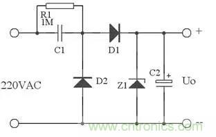 在實際應用中,可以用下圖代替上圖,這里用了Z1正向特性和反向特性,其反向特性(也就是其穩壓特性)來穩定電壓,其正向特性用來在市電負半周給C1提供放電回路。