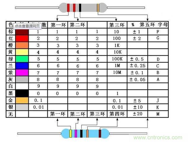 電阻器上用不同顏色的環來表示電阻的標稱阻值,常見的電阻器有四色環電阻和五色環電阻。四色環電阻,一般是碳膜電阻,用三個色環來表示阻值,用一個色環表示誤差。五環電阻一般是金屬膜電阻,精度更高,常用四個色環表示阻值,另一個色環表示誤差。