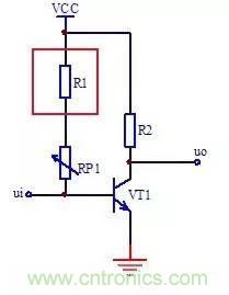 電阻R1用來限制電路中電流,防止可變電阻器阻值調到最小時,使得三極管VT1基極電壓等于電源電壓VCC,那樣會因為VT1基極電流太大而損壞VT1,這種電阻在電路中一般稱為保護電阻。