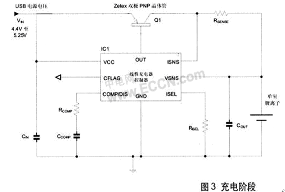 圖3顯示典型USB總線供電單室鋰離子線性電池充電器應用,在此應用中,Zetex低飽和ZXTP25020CFF雙極PNP晶體管同時具備反向阻斷能力。