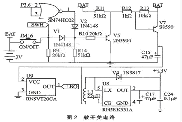 ② 在開(kāi)機(jī)狀態(tài)下,JM16鍵作為關(guān)機(jī)鍵使用。未按下JM16鍵時(shí),SWH信號(hào)點(diǎn)為低電平。按下JM16鍵,SWH信號(hào)點(diǎn)為高電平,這一信號(hào)變化通過(guò)鍵盤(pán)接口被單片機(jī)讀取;在開(kāi)機(jī)時(shí)檢測(cè)到JM16的閉合,可確定為關(guān)機(jī)命令;等到JM16鍵松開(kāi)后,單片機(jī)的P3.6輸出高電平并經(jīng)反相后通過(guò)V2使V5和V7變?yōu)榻刂範(fàn)顟B(tài),支付密碼器因?yàn)闆](méi)有電源供給而關(guān)機(jī)。在該供電電路中晶體管V7是電池供電的開(kāi)關(guān)元件,將它設(shè)在DC/DC轉(zhuǎn)換電路的前面,關(guān)機(jī)時(shí)將DC/DC轉(zhuǎn)換器的供電回路完全切斷,進(jìn)一步減小了關(guān)機(jī)時(shí)的漏電流。整機(jī)關(guān)機(jī)后,經(jīng)檢測(cè),關(guān)機(jī)電流小于5uA。圖2中的電池低電壓檢測(cè)報(bào)警由日本理光公司的RN5VT20CA(U9)實(shí)現(xiàn),檢測(cè)電壓為固定值2V。