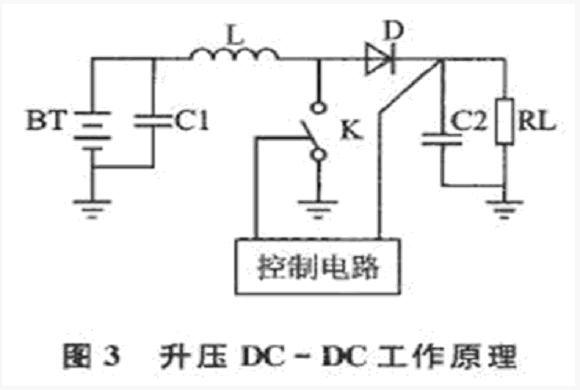 開(kāi)關(guān)K導(dǎo)通時(shí)電池BT給電感L充電,在L中以場(chǎng)的形式儲(chǔ)存能量1/(2L×I2)。 其中,I為電感電流。K斷開(kāi)后,L中的磁能又以電能的形式釋放給濾波電容C2和負(fù)載RL。周期性的開(kāi)關(guān)操作使電池能量源源不斷地送入負(fù)載,而輸出電壓被轉(zhuǎn)換為: