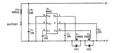 鋰離子電池保護電路包括過度充電保護、過電流/ 短路保護和過放電保護等,該電路就是要確保這樣的過度充電及放電狀態時的安全,并防止特性劣化。它主要由集成保護電路IC、貼片電阻、貼片電容、場效應管(MOSFET) 、有的還有熱敏電阻(NTC) 、識別電阻( ID) 、保險絲( FUSE) 等構成。其電路圖如圖1所示。
