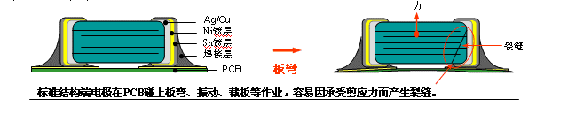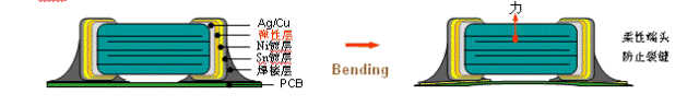 - 為電容端電極增加“彈性層”有效吸收外應力,降低裂縫的發生機率