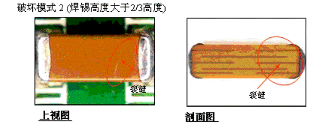 在破壞性的抗折板測試中,PCB板將持續彎曲直到貼片電容產生破壞為止,在這種模擬比較實驗中,可以發現具有柔性端頭設計的產品中,沒有在陶瓷結構中產生裂縫,而是從彈興銀層產生撕裂現象。