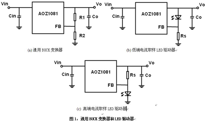 本文將基于AOZ1081來介紹反饋環的設計,因此先介紹一下AOZ1081的工作特點。AOZ1081是一款降壓型Buck變換器,工作于電流模式,其特點可以讓它配置成LED驅動器,同時也可以作為通用Buck變換器使用。其特點如下: