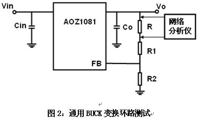 對于通用BUCK降壓型變換器,可以直接在反饋分壓電阻器上部電阻中,直接串接一個100歐姆的電阻R,由R注入測試信號,測量增益裕量和相位裕量,用于決定的系統的穩定程度,如圖2所示。注意到,相對于輸出的負載電阻,此回路相當于一個高阻抗回路,因此不影響系統的正常工作。