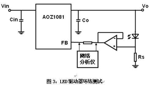 這樣,就必須引入一種隔離的電路,使注入的信號不影響電源系統的正常工作。通常,電壓跟隨器具有阻抗變化,也就是其輸入相當于開路,輸出相當于短路,同時,時還具有緩沖的作用,也就是在信號源和負載之間緩沖,將輸入信號無損耗的輸出。因此,可以使用圖3的電路測量LED驅動器的環路穩定性。