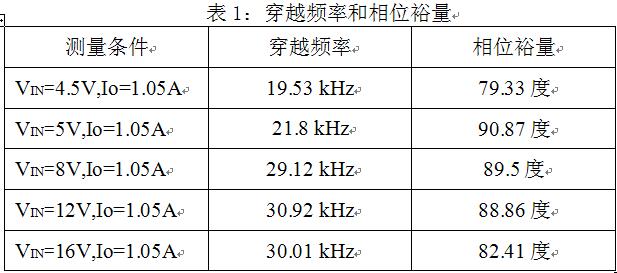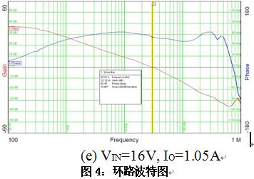 基于AOZ1081設計LED驅動器,輸入電壓4.5 V到16 V,輸出為一個HB LED,;使用Venable的3120測量環路,Rc=61.9kohm,Cc=820pF,測量波形和結果如圖4和表1所示。