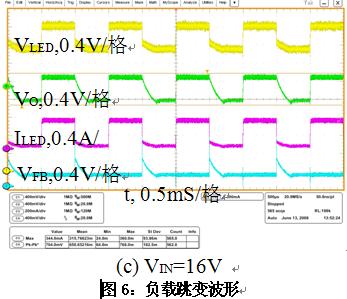 可以用圖5的負載跳變來驗證系統的穩定性,MOS驅動信號的頻率為1kHz,負載電流從35mA到350mA跳變,波形如圖6所示