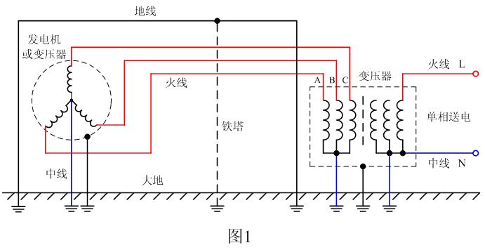 在圖1中,紅線A、B、C表示高壓輸送線路,高壓輸送線路一般都用鐵塔空架支撐,用以對(duì)幾十萬(wàn)伏的交流電進(jìn)行遠(yuǎn)距離傳送,這樣,其經(jīng)常受雷擊是不可避免的;為了避免雷擊,一般都在高壓線路的上方平行架設(shè)一條地線,這條地線一般稱為避雷地線。所謂地線就是與大地相連的導(dǎo)線,當(dāng)打雷的時(shí)候,雷電首先會(huì)打到避雷地線上,避雷地線可把雷電引入地球,避免高壓輸送線路被幾億伏,乃至十幾億伏的雷電把發(fā)電機(jī)或變壓器的線圈與外殼擊穿,以及把與線路連接的其它電器設(shè)備遭受瞬間高壓沖擊而損壞。因此,圖1中的避雷地線與一般電子線路中的地線完全是兩回事。