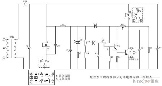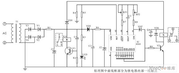 該電路核心部分由IC4541構成,延時設定由RP2、C*設定,A-B端根據(jù)需求接相應高、低電平(設定端)內部2繞組閉鎖繼電器采用DC12V(因繼電器工作電壓與IC4060組成延時電器要低,則為保證其驅動則分別由V6、V7、V1、V3構成)。其中C2為二次儲能器件,可根據(jù)延時的長短予以調整,C4為完成S置位線圈工作。
