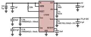 LT3050可向汽車的控制系統提供診斷信息。如果檢測到開路或短路情況、或者IC進入熱停機模式,則一個能夠吸收100μA電流的集電極開路故障指示器將確定其電平。LT3050還具有一個集成電流監視器,該電流監視器通過IMON引腳提供約為輸出電流1/100的電流,以在天線系統監視和保護中使用(見圖5)。只需在IMON和GND之間連接一個電阻器,便可產生一個與輸出電流成比例的參考于地的電壓。