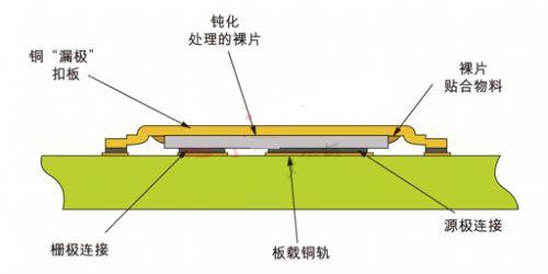 圖2:DirectFET的橫切面:硅芯片的溫度和電力接口盡量縮小尺寸,同時電力和溫度性能也遠遠超出采用鍵合線的標準封裝。