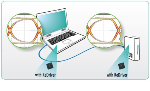 如果放在接收器之前,轉接驅動器可以有效打開信號眼圖的開口,從而將信號質量恢復到可以接收的范圍內。轉接驅動器可以調節信號、使用信號均衡的功能減少信號衰減和抖動,因此可以在更長的距離和通過多個連接器的情況下提供干凈的信號傳送通道。信號可以恢復原有的強度再次傳送,就像是將信號通道拆成數個段落,并且在每個段落恢復信號的質量。轉接驅動器也允許產品設計師依照特定的應用類型調整最佳的信號均衡效果,因此可以確保設備可以通過最嚴格的USB3.0認證要求。