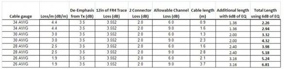 在一般的筆記本電腦至外圍設備的應用中,信號會經過長于12英寸的PCB線路(10英寸線路在筆記本電腦中,2英寸在接口設備中),這將導致3.552dB的線路損耗(12英寸x0.296dB/英寸,使用9/10/9FR4走線,2.5GHz信號速度,不包括任何PCB導通孔)。加上每一個連接器產生的-1dB損耗,通過兩個連接器產生的損耗一共是2dB,因此留給線纜的信號損耗預算只剩下5.948~8.948dB。有遮蔽差分信號對線纜、2.50GHz速度的信號衰減大約是在34AWG的4.4dB/m到26AWG的1.9dB/m范圍內。表1列出了根據這些數字計算出的能符合USB3.0規范的SDP線纜的最大長度。表1中第三列到最后一列顯示,如果不使用信號調節產品,即便高質量的28AWG線纜,也無法達到USB3.0規范要求的3米長度。