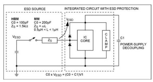 靜電放電強(qiáng)度以電壓形式表示,該電壓由電容的儲(chǔ)能電荷產(chǎn)生,最終傳遞到IC。作用到IC的電壓和電流強(qiáng)度與IC和ESD源之間的阻抗有關(guān)。對(duì)電荷來(lái)源進(jìn)行評(píng)估后建立了ESD測(cè)試模型。
