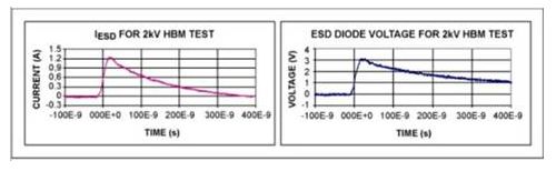 如果對(duì)IC引腳進(jìn)行 HBM測(cè)試,測(cè)試電路的初始電壓是2kV,通過(guò)ESD二極管的電流約為1.33A(圖2):