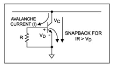 雙極型IC的箝位電路類(lèi)似于在受保護(hù)核電路中提供一個(gè)受沖擊時(shí)擊穿的部件,圖3給出了圖1中箝位功能的詳細(xì)電路。箝位晶體管的過(guò)壓導(dǎo)致集電極-基極之間的雪崩電流,發(fā)射結(jié)的正向偏置會(huì)進(jìn)一步提高集電極電流,導(dǎo)致一個(gè)“突變”過(guò)程。箝位時(shí)的V-I特性曲線(xiàn)如圖4所示。