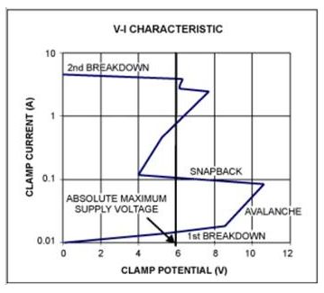 箝位電壓從第一次擊穿變化到突變穩(wěn)定后的導(dǎo)通電壓,如圖5所示。為保證箝位時(shí)關(guān)閉正常的工作條件,設(shè)計(jì)的箝位電壓一般要略高于IC的絕對(duì)最大電壓。
