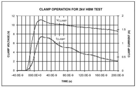 箝位二極管在IC其它電路遭到破壞之前導(dǎo)通,箝位管要有足夠的承受力,保證ESD電流不會(huì)導(dǎo)致二次擊穿。2kV HBM測(cè)試的箝位過(guò)程如圖5所示,圖5中的電壓包括I-R壓降和突變穩(wěn)定后的箝位電壓。