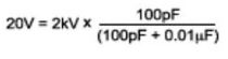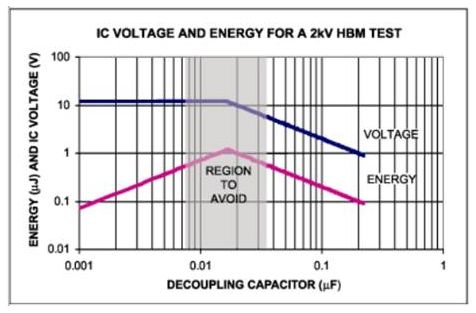 對(duì)于一個(gè)給定的去耦電容,ESD測(cè)試中初始電壓的變化遵循電荷守恒原理。例如,使用一個(gè)0.01μF去耦電容,2kV HBM測(cè)試電壓可以達(dá)到20V: