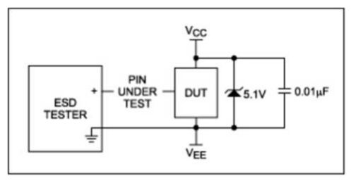 箝位電壓高于IC所能承受的電壓(典型值6V),低于二極管的擊穿電壓(約10V)時(shí),對(duì)于存在去耦電容的情況,因?yàn)殡娙輧?chǔ)能可能導(dǎo)致某些問(wèn)題。如果IC 在沒(méi)有外部電路的情況下進(jìn)行測(cè)試,引腳上作用10V電壓是可以接受的,對(duì)器件不會(huì)構(gòu)成威脅。