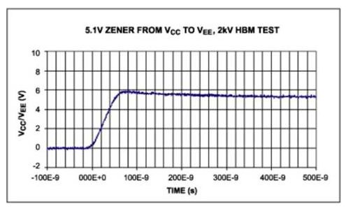 電源去耦電容會(huì)影響箝位操作,傳遞到去耦電容的電荷會(huì)產(chǎn)生高于IC絕對(duì)最大值的電壓,但還不足以使箝位電路導(dǎo)通。這時(shí)的電容相當(dāng)于一個(gè)能源,迅速向器件注入能量。
