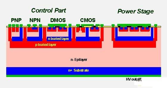 這個特性使共射-共基放大器結構的開關性能比一個標準雙極晶體高出很多,可與一個場效應MOS晶體管媲美。因此,我們說這個器件沒有電荷貯存效應。這項技術的控制部分是采用BCD(雙極-互補MOS-雙擴散MOS)單元庫實現的。