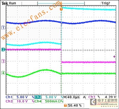 圖2的波形代表一個工作電路。放大器的輸出之一(上跟蹤,深藍色)是一個1kHz正弦波直流偏壓為2.5V。第二次跟蹤(青色)是線束上看到的信號。這也從一開始就是在2.5V直流偏置一個1kHz正弦波,但200μs是一個18V電源短路。第三次跟蹤(洋紅色)是分流穩(wěn)壓器輸出,最初在11V的偏見,但拉回應(yīng)過壓條件地面。第四次跟蹤(綠色)線束的電流。最初是一個正弦波,電流下降到零這個回應(yīng)過壓條件。